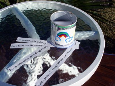 Have children bring in a plastic or cardboard can from icing, potato chips, or drink mix. (Avoid tin cans because the edge can be sharp.) Write summer activities so they can be cut in strips and placed in the can. Let children cover their cans with paper and decorate with drawings, stickers, or collage materials. Put the strips of summer fun in the can. Send the can home with a note encouraging the parents to let their child select a strip each day and do the activity.