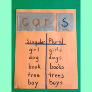 Children draw a T-chart on a sheet of paper. On the left side they write the singular form of nouns. On the right side ask them to write the plural form. Can they read the words?