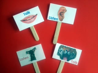 Glue a copy of a mouth on one stick and an ear on another stick. Two children sit facing each other. Each chooses a stick. The one with the mouth talks while the one with the ear listens. Take turns switching sticks and listening and talking.