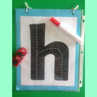Insert them in clear sheet protectors with the uppercase letter on one side and the lowercase letter on the other side. Children can use toy cars to drive over the letters.