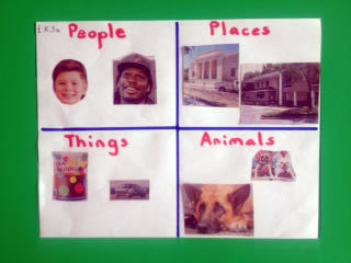 in the sections. Give children old newspapers and catalogs and ask them to cut out pictures of people, animals, places, and things and glue them in the appropriate section. Can they label their pictures?