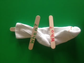craft sticks and place them in a sock. Children sit facing a partner. One child chooses a stick and asks their partner a question using the word. The partner answers and then takes the sock and chooses a word. Children continue asking and answering questions.