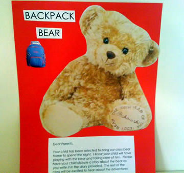 Directions: Put a teddy bear, diary/spiral notebook, crayons, pencils, and some personal items for the bear, such as clothes, a toothbrush, blanket, etc. in a backpack. Children take turns wearing the backpack home and having the bear spend the night with them. Write a note similar to the one below asking parents to write stories about the bear’s adventures in the notebook. The teacher reads the notebook to the class the following day.