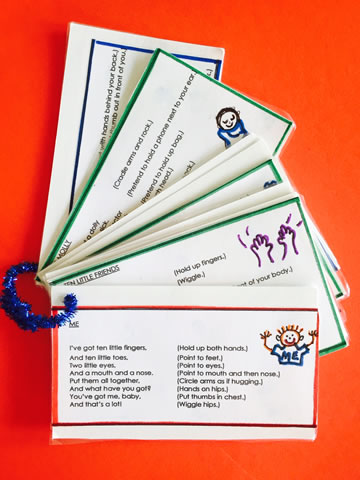 skills, short term memory, phonological awareness, math concepts, etcetera, etcetera. Finger plays can be used to engage children’s attention and they are perfect for transition times. Glue copies of finger plays to index cards and punch a hole in the upper left hand corner. Attach to a book ring and introduce one each week. Speech and language specialists emphasize the importance of doing these over and over and over again to improve fluency.