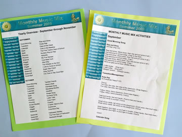 Here’s a link where you can get some suggestions for a good morning song, calendar song, phonics song, seasonal song, wiggle song, and good-bye song for each month. Monthly Music Mix