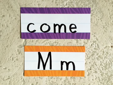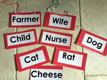 To reinforce print knowledge make nametags for the different characters in the song. Call children’s attention to the letters and sounds in each word. Let children wear the nametags and join the song at the appropriate time.