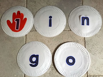 Make paper plate letter puppets for the children to hold as you sing. Take two paper plates and staple 2/3 of the way around. Print a different letter (B, i, n, g, o) on the front and draw a hand on the back. Children insert