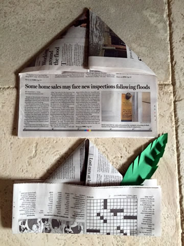 Make Yankee Doodle hats from newspaper. Fold a sheet of newspaper in half. Fold down the top corners to the middle. Bend one section of the bottom up. Turn over and bend the other section of the bottom up. Staple at the corners. Let children decorate with markers and a paper feather.