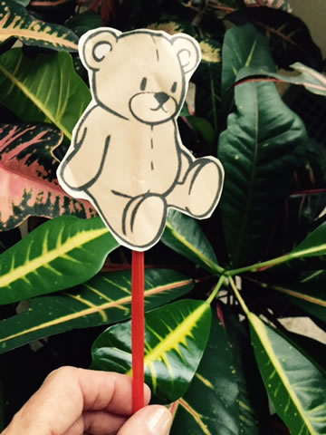 Staple a paper bear to a straw. Have children use their bear to make the movements in the poem. Call out other positional words and directions for the children to follow with their bear puppets. For example: Can you put the bear on your head? Can you put the bear under your chin?