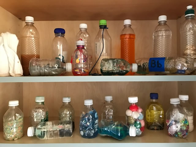 Make one bottle each week and introduce it to your class. Store the collection on a “discovery” shelf in your classroom. You could also keep them in a basket or the cardboard carton six-pack drinks come in.
