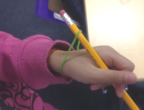 Silly Band Seat Belt – Give children a silly band or loose rubber band to wear around their wrist when they write. Explain that when you go in the car you have to wear a seat belt and when you write you need to put a seatbelt on your pencil. Demonstrate by picking up a pencil and slipping the end of the band over the pencil. Mom and dad (index finger and thumb) will be in the front and the kids (other three fingers) will be in the back.