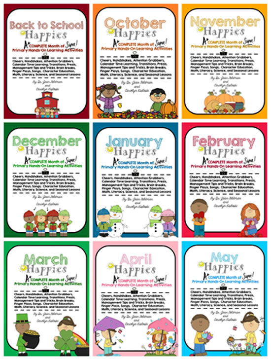 We have put together “the best of” our 50+ years of teaching experience for each month with tried and true ideas.   There are over 100 pages of hands-on learning activities with cheers, handshakes, attention grabbers, transitions, Prezis, management tips, brain breaks, finger plays, math, literacy, science, and seasonal lesson plans.  There 15+ song downloads with books and visuals, as well as a video where Dr. Jean demonstrates the activities.