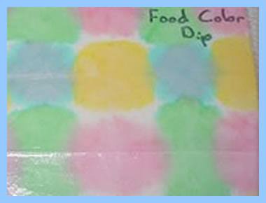 Fill several small cups half way with water. Add 10 drops of food coloring to each cup. Let the children fold a paper towel into a small square. Dip each corner in a different color. Open and dry.