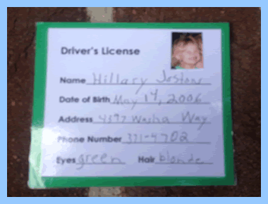 Have a safety lesson about riding toys. Draw parking spaces and road signs on the pavement with chalk and have the children practice riding their bikes and obeying the signs. Make a driver’s license with the child’s photo, name, address, and personal attributes.