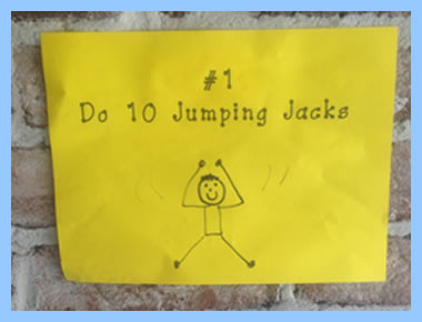 Get scrap cardboard, a marker, tape, and you’ll be set to make your own fitness trail. Cut the cardboard into 8” x 10” pieces. Write different body and brain exercises on each card and tape to different locations on your playground. For example: