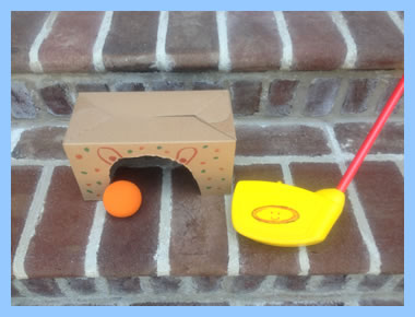 You will need several empty cardboard containers or boxes. Turn the containers upside down and cut an arch out of the bottom similar to a mouse hole. Set the containers up on the grass and let the children practice hitting golf balls in the holes. *You can also make a golf course with hula hoops.