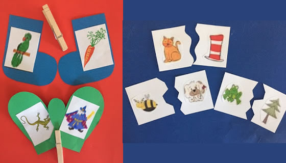 Make games similar to the one shown so children can practice matching objects that rhyme.