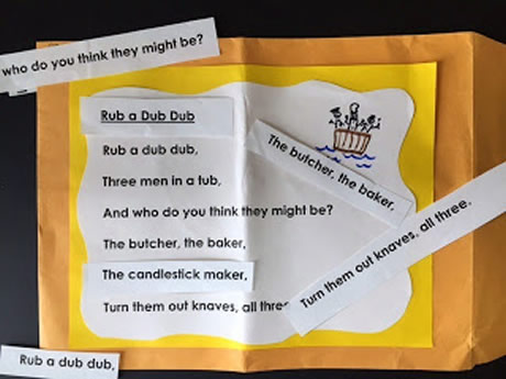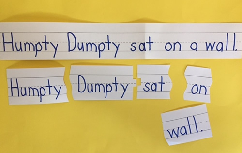 Write rhymes on sentence strips. Cut between the words and let children put them in the correct order in a pocket chart.