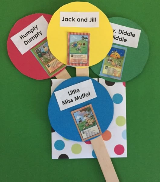 Cut 3 1/2" circles out of heavy paper and glue them to jumbo craft sticks. As you learn new rhymes write them on the circles and save them in a can. When you have a few extra minutes, children can pull out a "rhyme pop" and lead their classmates in saying the nursery rhyme.